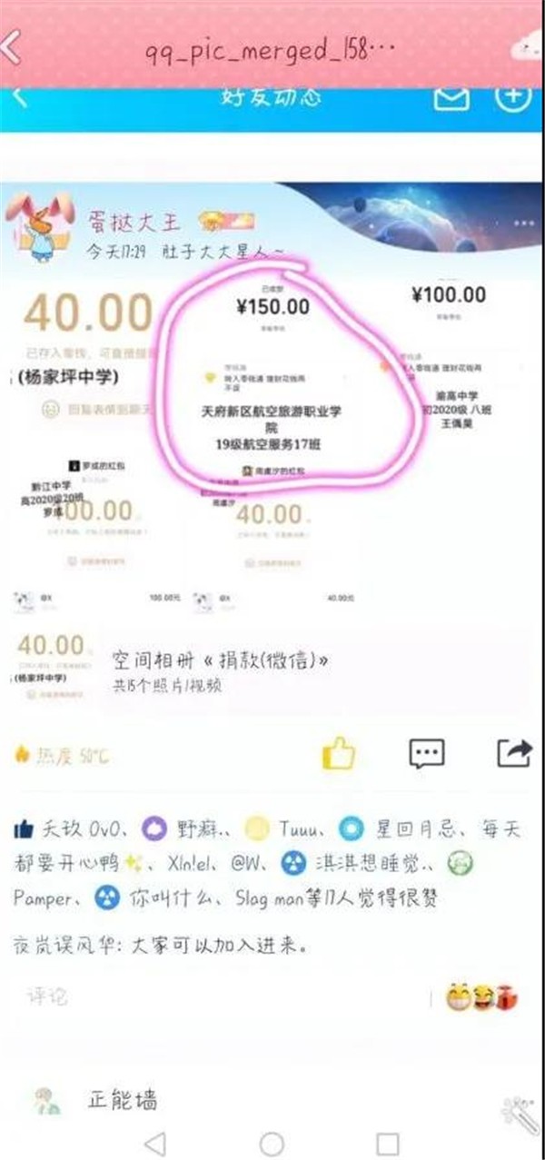 2020年1月28日至1月29日为期两天,我们共筹集善款882.8元,捐赠人有我院的学生,她们是来自19级民航运输10班的姜思佳、18级民航运输6班的彭思琪、18级民航运输5班的魏星园、18级民航运输6班的王阳、19级航空服务20班的王菁、19级航空服务20班的徐菲、19级航空服务20班的李帛益、19级航空服务22班的康贤芝,还有四川和天津的一些爱心人士。我相信,只要我们中国人团结一心,共同努力,互相帮助,万众一心,我们一定能打赢这场防疫阻击战!