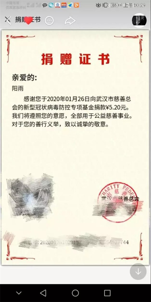 抗疫期间,作为学生的我最好方式就是待在家里,不给国家添乱。我在微信公益项目看到抗疫捐款公益活动,我就捐了50元。