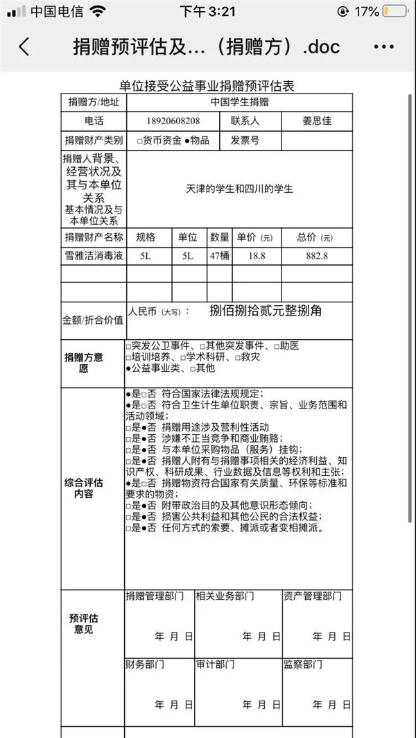 我是天津人,当我得知疫情爆发的那一刻,我就时刻关注着有关疫情的所有新闻,全国人民一起努力支援武汉,所有物资供应武汉,后来得知江苏省无锡市人民医院也非常缺乏物资,我也想做一点事情尽一点微薄之力,于是我就组织身边的朋友进行捐赠物资的募捐活动,很感谢我院18级民航运输6班的彭思琪同学的帮助,和我一起完成此次捐赠。