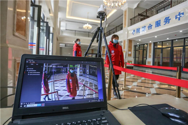 体温检测组实时观察“红外线体温检测系统”,询问入校学生近期健康情况,引导学生进行手部消毒和更换应急口罩,废弃口罩装入专用收纳箱。