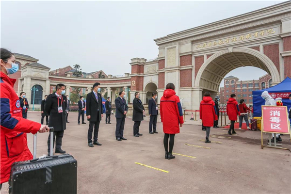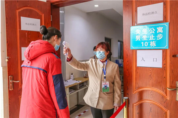 学生返校前,秩序维护组、体温检测组、消毒工作组各组人员到达指定位置,做好学生返校准备。