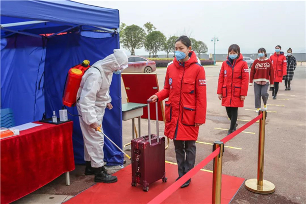 返校学生进入“入校专用通道消毒区”后,消毒工作组对返校学生脚部和行李进行消毒后,学生进入“红外线体温检测区”。