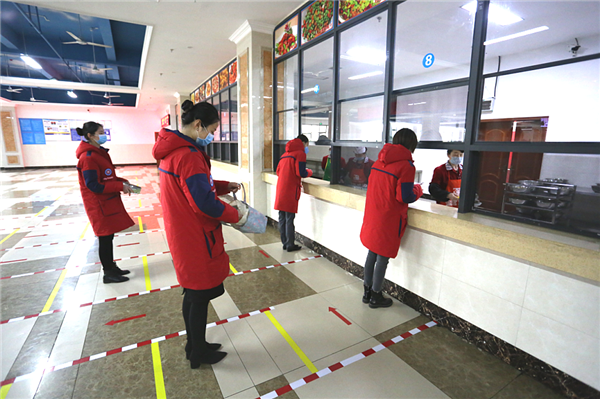 在打饭窗口前,根据地面张贴标识,有序在打饭窗口前排队,前后相邻两人间隔1米以上。