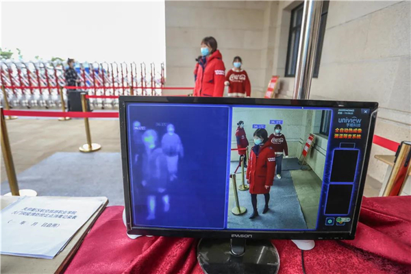 师生在进入教学大楼前,需佩戴好口罩,有序在“测温专用通道”前排队,前后相邻两人间隔1米以上,进入“红外线体温检测区”,对师生进行体温检测,确保师生检测体温正常。