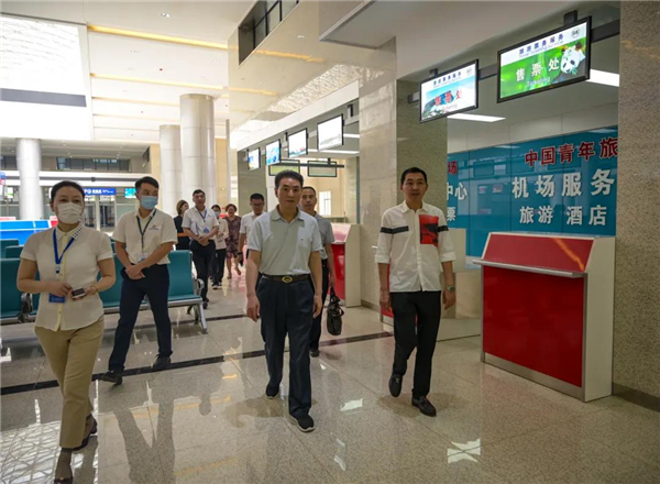 在学院大门口,宋思彬一行首先体验了红外线体温监测,并详细了解红外线测温仪的特点和使用方法。辜英智向宋思彬一行汇报了学院每栋楼的名字由来,每一个雕塑的含义,以及学院建筑风格等。穿过宽阔的瑞丽广场,来到学院的实训中心。宋思彬一行详细询问了空客的安检流程,并对安检的质量予以了高度的评价。他坦言,在这里有一种置身机场的感觉。