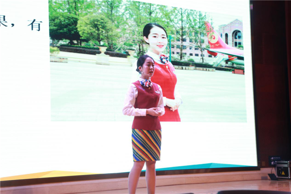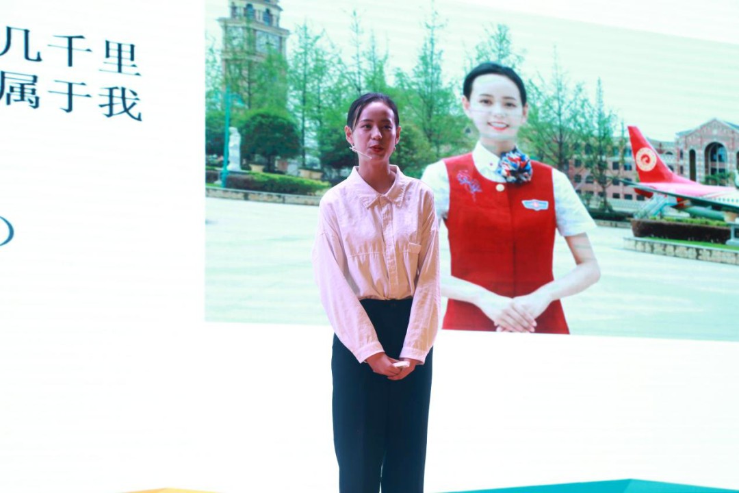 2019级空乘5班的张沥尹同学图文并茂、生动形象的讲解四川火锅,凭借精湛的讲解获得主持人大赛季军,学院团委副书记石慧为她颁奖。