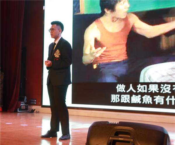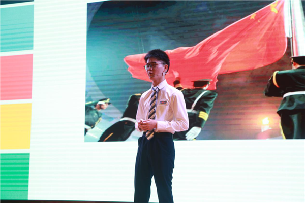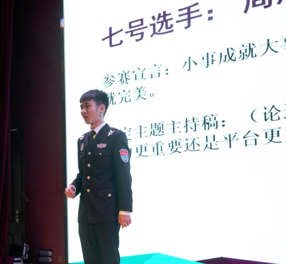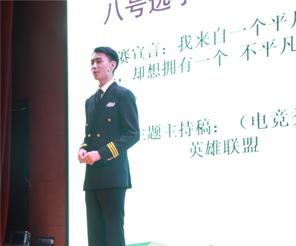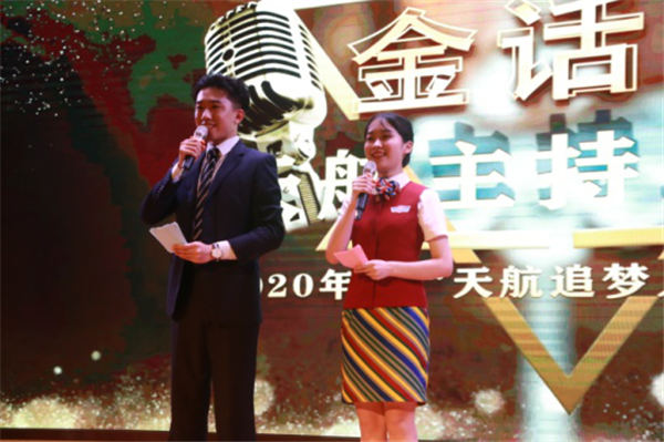 2019级地勤3班的丛海晨同学以诙谐幽默的方式在舞台上演绎着另类主持,最终凭借其独特的主持风格获得主持人大赛亚军,眉山东星航空职业学校执行校长杨校长为他颁奖。