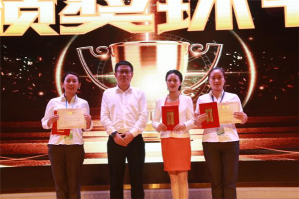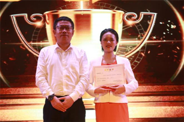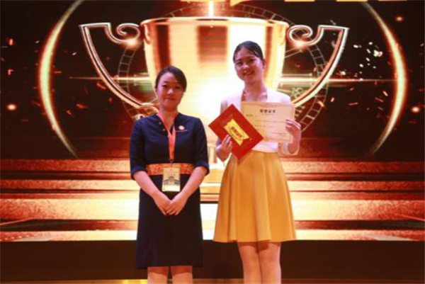 2018级空乘2班的刘洁源同学在舞台上侃侃而谈,凭借扎实的主持功底及优秀的表现得到了评委的一致认可,获得本次主持人大赛冠军,四川东星航空教育集团董事长助理刘胜辉为她颁奖。