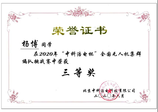 本次大赛由中科浩电主办,深圳高巨创新科技开发有限公司独家支持,面向全国高职、中职类院校在校生,共有301支队伍报名参赛,我院学子积极备战,通过线上培训、线上编程、线上测试,最终以第44名的成绩获得三等奖。同学们在比赛中收获了很多,展现了天航学子的风采。