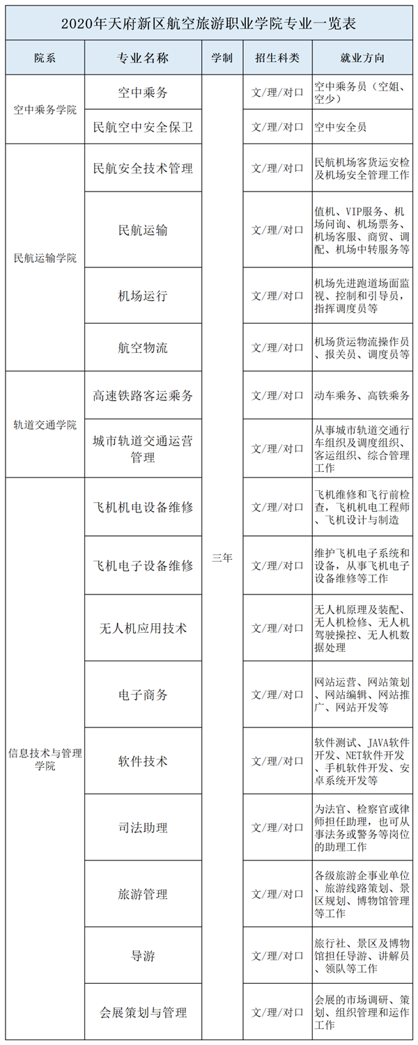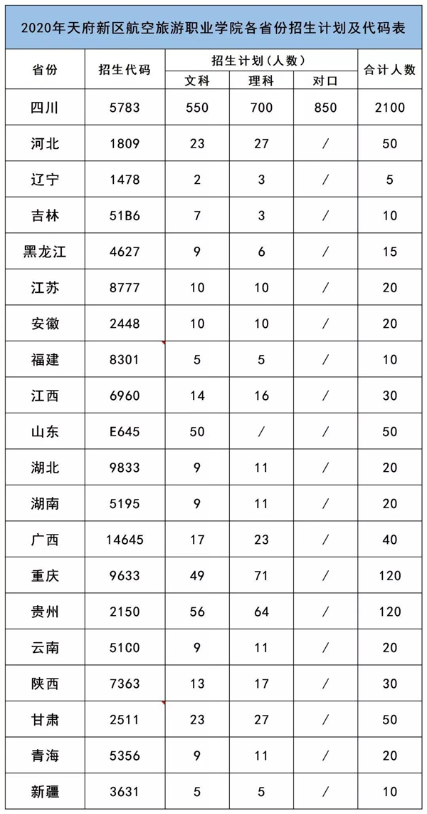 注:各省份具体招收计划详见“2020年天府新区航空旅游职业学院各省份招生计划及代码表”。