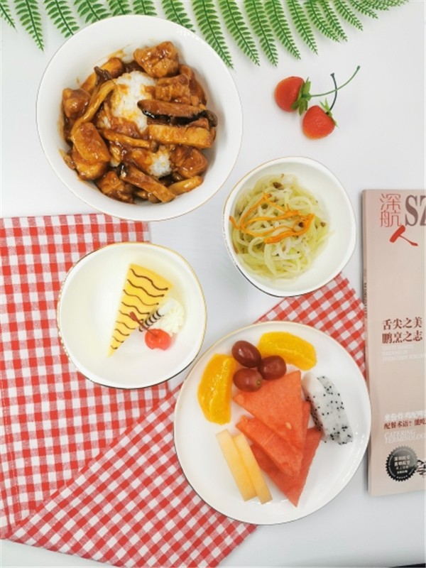 据介绍,深航机上热食恢复以后,选乘深航公务舱出行的旅客可以品尝到芦笋炒木耳、板栗烧鸡、萝卜牛腩、香菇烧麦、希波饼,以及鲜切水果、酸奶、甜点等营养均衡的健康餐点。经济舱旅客可以享用鱼香肉丝、金汤薏米鸡、以及土豆牛肉和西芹鸡片双拼饭。
