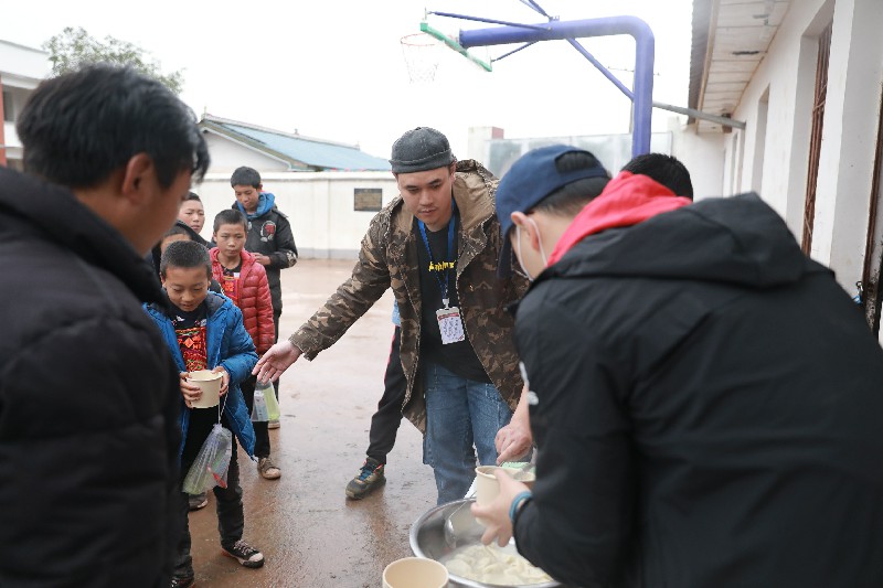 村小的小朋友很少有机会吃上蛋糕、饺子。当天,志愿者们天刚微亮就去菜市场进行了一番大采购,为了中午给孩子们亲手包一顿饺子。很多人第一次学着擀面皮、捏褶、第一次在露天的操场包饺子、第一次烧柴火……虽然包出来的2000个饺子形态各异,虽然一直弯着的腰有点酸痛,但是志愿者们看到孩子们吃着饺子的那种开心,显得十分满足。