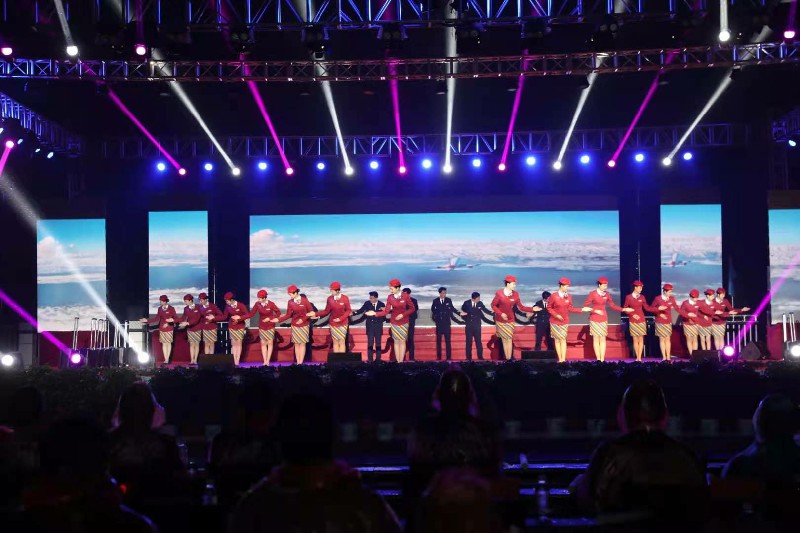 晚会上,由我院礼仪队的优秀学生带来的航空礼仪操《中国机长 中国空姐》,将礼仪文化与舞蹈相结合,各位准空姐、准空少的出场将现场气氛推上高潮,掌声、欢呼声、尖叫声不断,经久不息。张学友、刘德华模仿秀带来的《一路上有你》、《饿狼传说》、《中国人》、《爱你一万年》等更是将整个晚会推向了高潮,全体师生的热情都在此刻被点燃。
