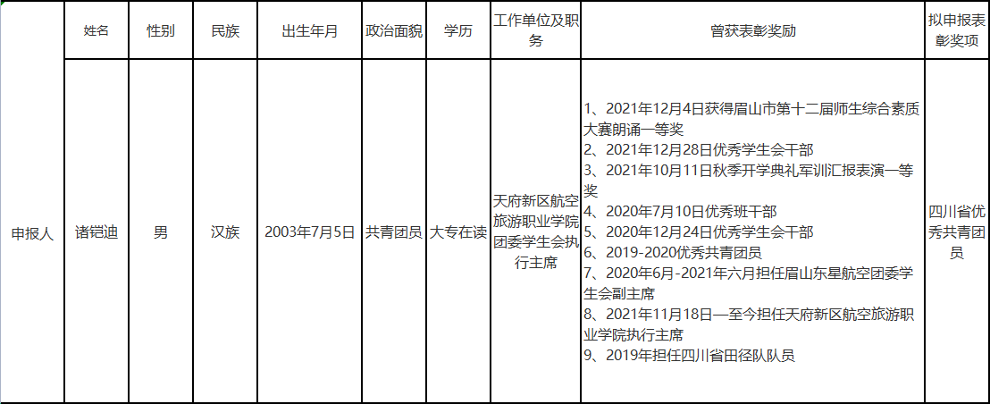 根据共青团四川省委《关于开展“四川省五四红旗团委(团支部)”“四川省优秀共青团员”“四川省优秀共青团干部”申报工作的预通知》精神,经二级学院团总支组织申报推荐,所在二级学院党总支审核同意,校团委上报党委会研究决定,拟将空乘学院诸铠迪作为推荐对象人选,现进行公示。