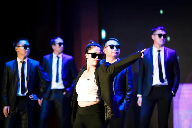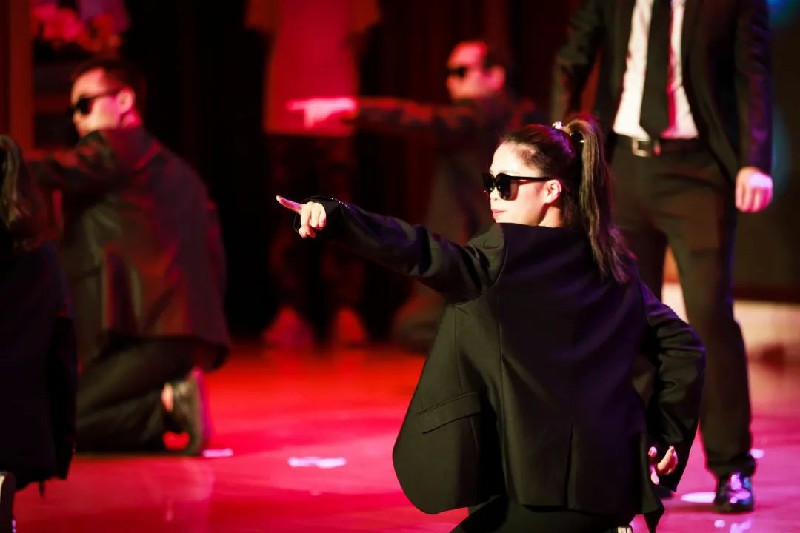酷炫的黑衣人,手拿手杖,还有四位梳着马尾的女老师登台,跳着精彩舞步。