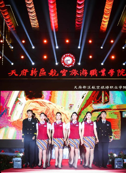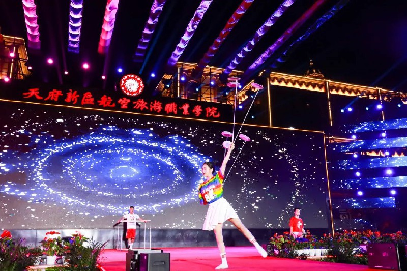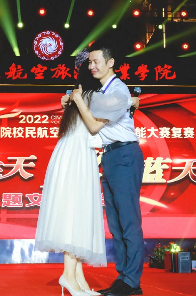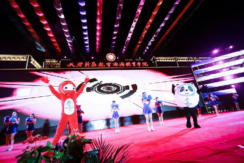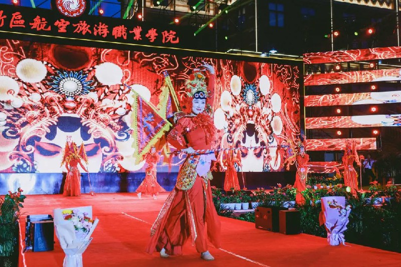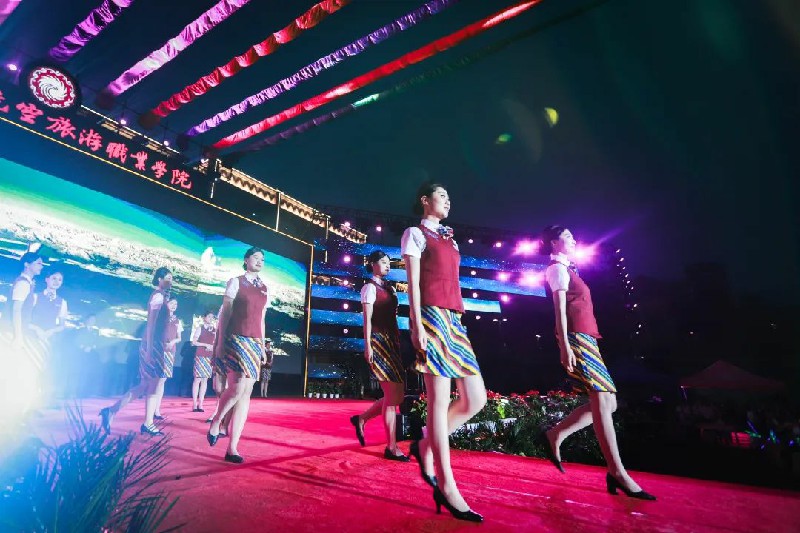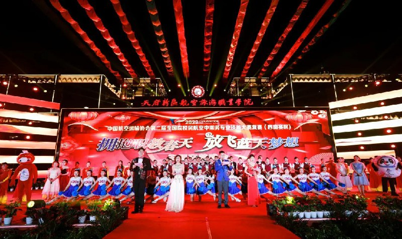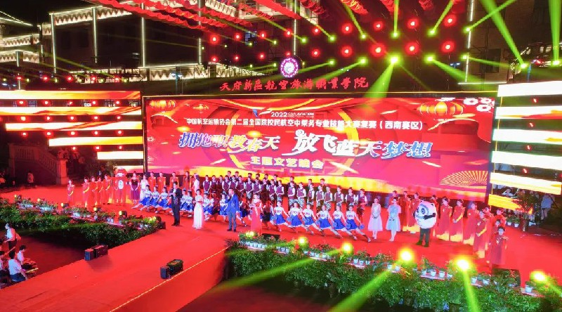 6月10日下午6点30分,雨过天晴,在1万5千余名师生的期待下,天航学院的运动场上,彩带飞舞似长虹,礼炮齐鸣庆典礼。第二届全国院校民航空中乘务专业技能大赛复赛(西南赛区)正式开幕。为庆祝这个全国性的赛事,学院精心准备,隆重举行了“拥抱职教春天、放飞蓝天梦想”主题文艺晚会。中国国粹“川剧变脸、吐火、俏花旦、水袖”节目、现代摇滚音乐、央视《开门大吉》歌手“小杨钰莹”宋颂带来的甜歌演唱等节目,让这台晚会精彩纷呈,全体师生和来宾们共同享受了这场盛大的视听盛宴。