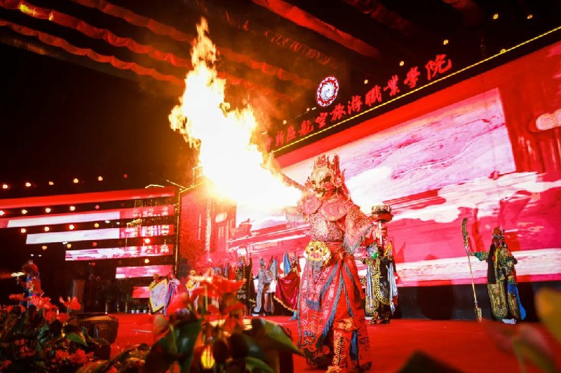 最后,观众最期待的吐火环节上演。只见两位威风凛凛的“关公、赵子龙”,手擎火炬,稍一吹气,“火从口出”,精彩万分。