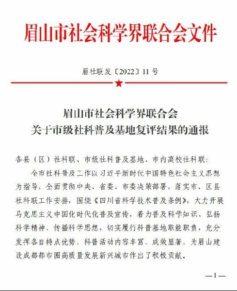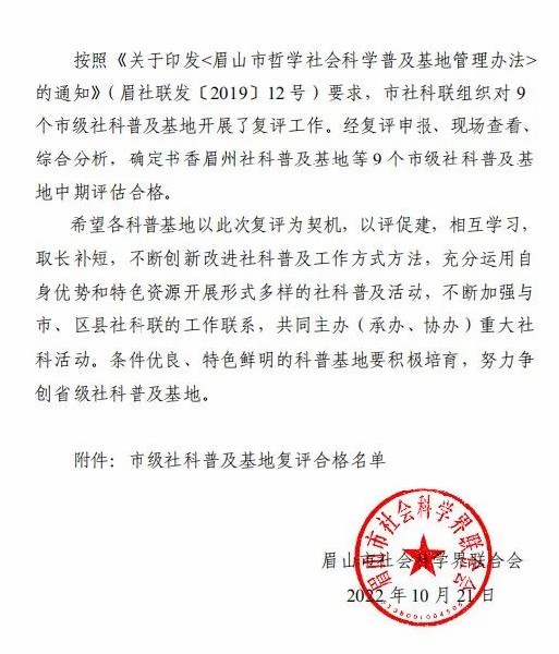 据眉山市社会科学界联合会官网消息,围绕《四川省科学技术普及条例》,按照《关于印发<眉山市哲学社会科学普及基地管理办法>的通知》(眉社联发〔2019]12号)要求,为规范和加强社科普及基地的管理,眉山市社科联组织对9个市级社科普及基地开展了复评工作,遵照“严格标准、严格程序、严格评审”的原则,我校申报的“民航知识教育社科普及基地”复评结果为合格。