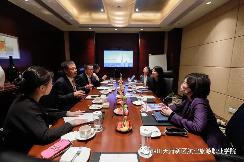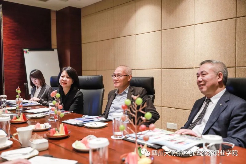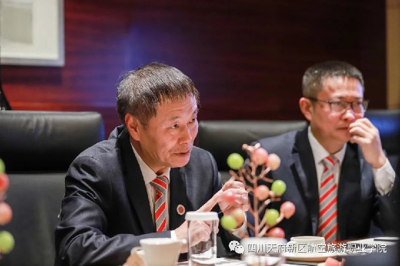 在听取刘存绪院长的讲话后,双方代表深入交流,香格里拉大酒店(成都)有限公司区域总经理垢哲浩,首先代表成都香格里拉酒店对天府新区航空旅游职业学院院长刘存绪一行的来到表示热烈欢迎,并高度赞扬了学校近年来所取得的办学成就。垢哲浩说,天府航空旅游职业学院的毕业生能力出众,深受用人单位好评,随着香格里拉酒店的发展,也需要大量专业对口的职业人才。