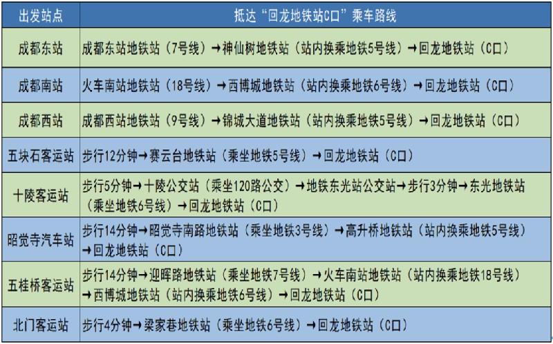 ③学院在成都地铁5号线(6号线)回龙地铁站C口设立新生接站点,滚动发车。各出发站点抵达“回龙地铁站C口”乘车路线如下: