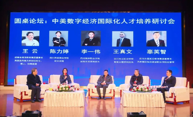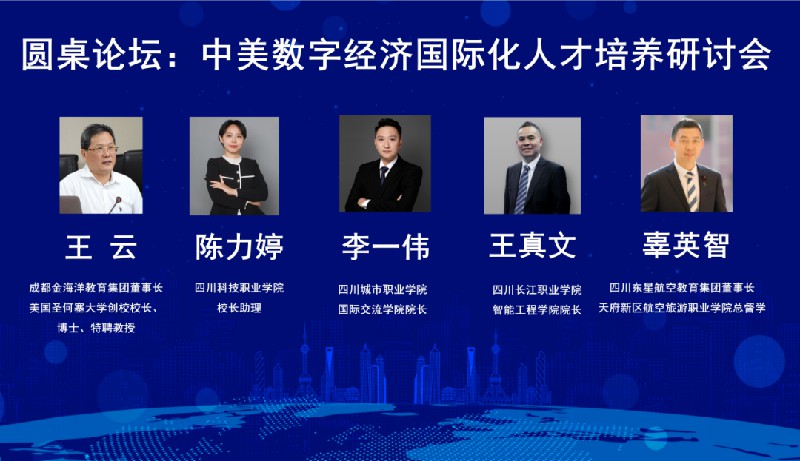 主题分享结束后,王云博士主持了圆桌讨论。四川科技职业学院校长助理陈力婷、四川长江职业学院智能工程学院院长王真文、四川城市职业学院国际交流学院院长李一伟、天府新区航空旅游职业学院总督学辜英智分别发言,共同探讨了当前处于数字经济时代的国际人才培养模式。