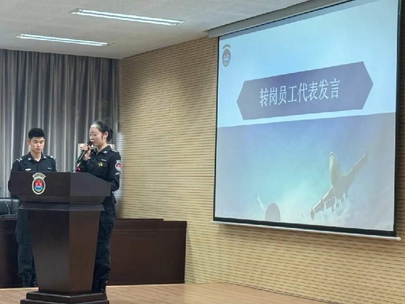 转岗员工代表罗琴发言,在实习期间,我们不仅学到了专业技能,更锻炼了团队协作和解决问题的能力。同时也深知工作机会来之不易,因此将倍加珍惜未来的工作机会,努力为安全检查站的发展贡献自己的力量。