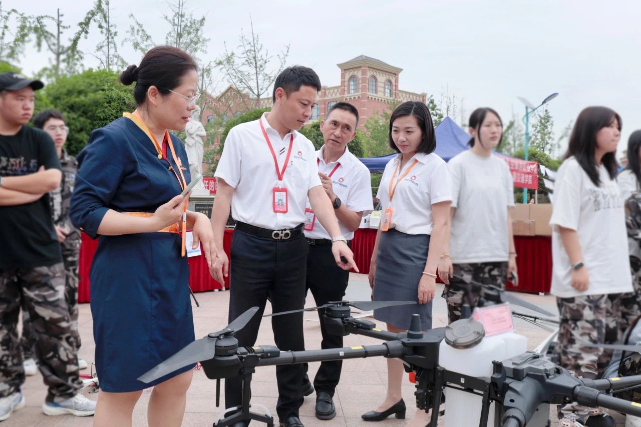 信息技术学院展演数架无人机,其中可编程喷洒路径与雾化施药技术的新型无人机生动诠释了科技助农新范式,充分展现了学院在科技应用与创新领域的卓越教学成果。