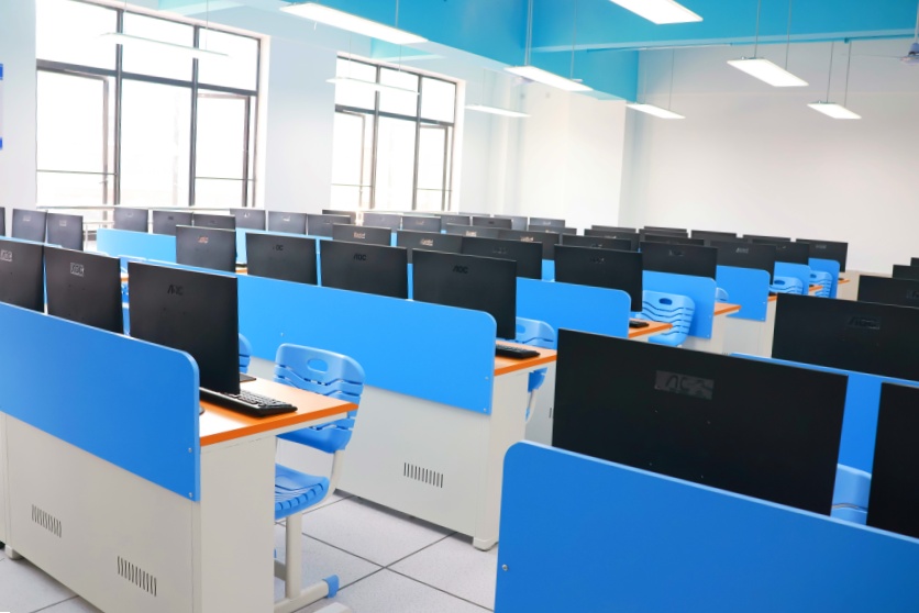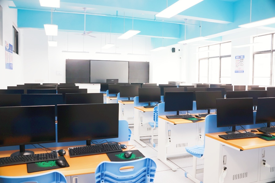 信息技术学院多功能媒体实训室,是集理论、模拟实训、多媒体演示于一体的现代化教学空间,专为信息技术相关专业人才培养量身打造。实训室配备高清交互式电版、专业音响设备,支持同学们实操演练的同时,同步理解课程的课件讲解。助力学生开展项目小组讨论、方案汇报等。此外,实训室内还接入校园智慧教学平台,实现教学资源共享。作为信息技术学院产教融合的重要教育教学阵地,为学校的人才培养提供高效、智能的教学支撑。