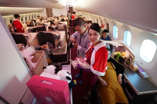 特别的是,飞往三亚的HO1225的航班号正巧与圣诞节的日期相同。为此全体乘务组提前策划、精心准备,着力打造圣诞主题航班。除了“金灿灿”的圣诞版首航蛋糕外,吉祥航空为每位头等舱旅客准备了精致的杯子蛋糕;同时在客舱中布置了圣诞贺卡和吉祥熊猫玩偶,增添圣诞气氛。乘务员则穿上圣诞装扮,给旅客送来圣诞惊喜。另外,吉祥航空精心装饰了虹桥机场的值机柜台,开展圣诞集市活动,现场派发圣诞小食与精美礼品,为旅客送上圣诞与新年祝愿。