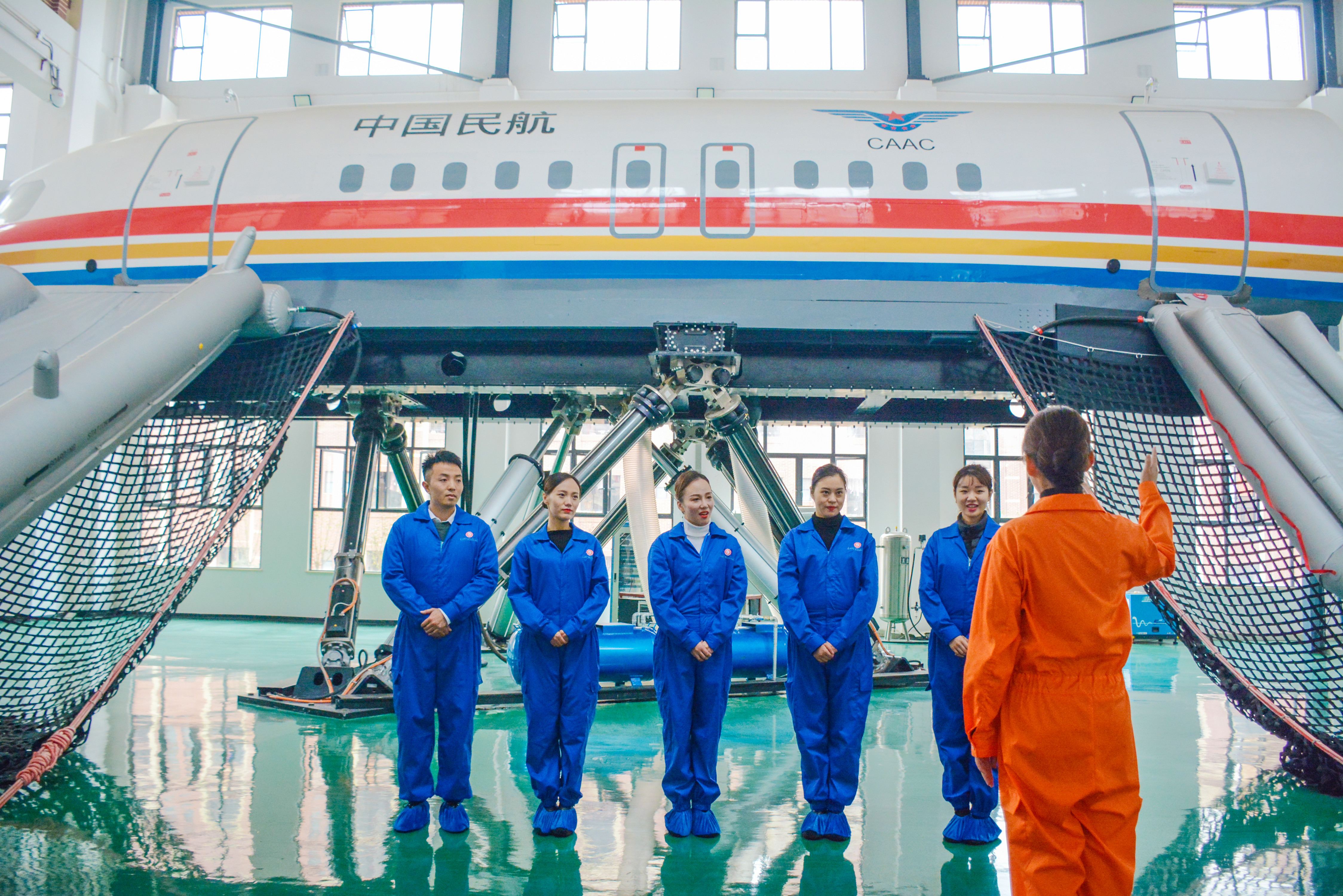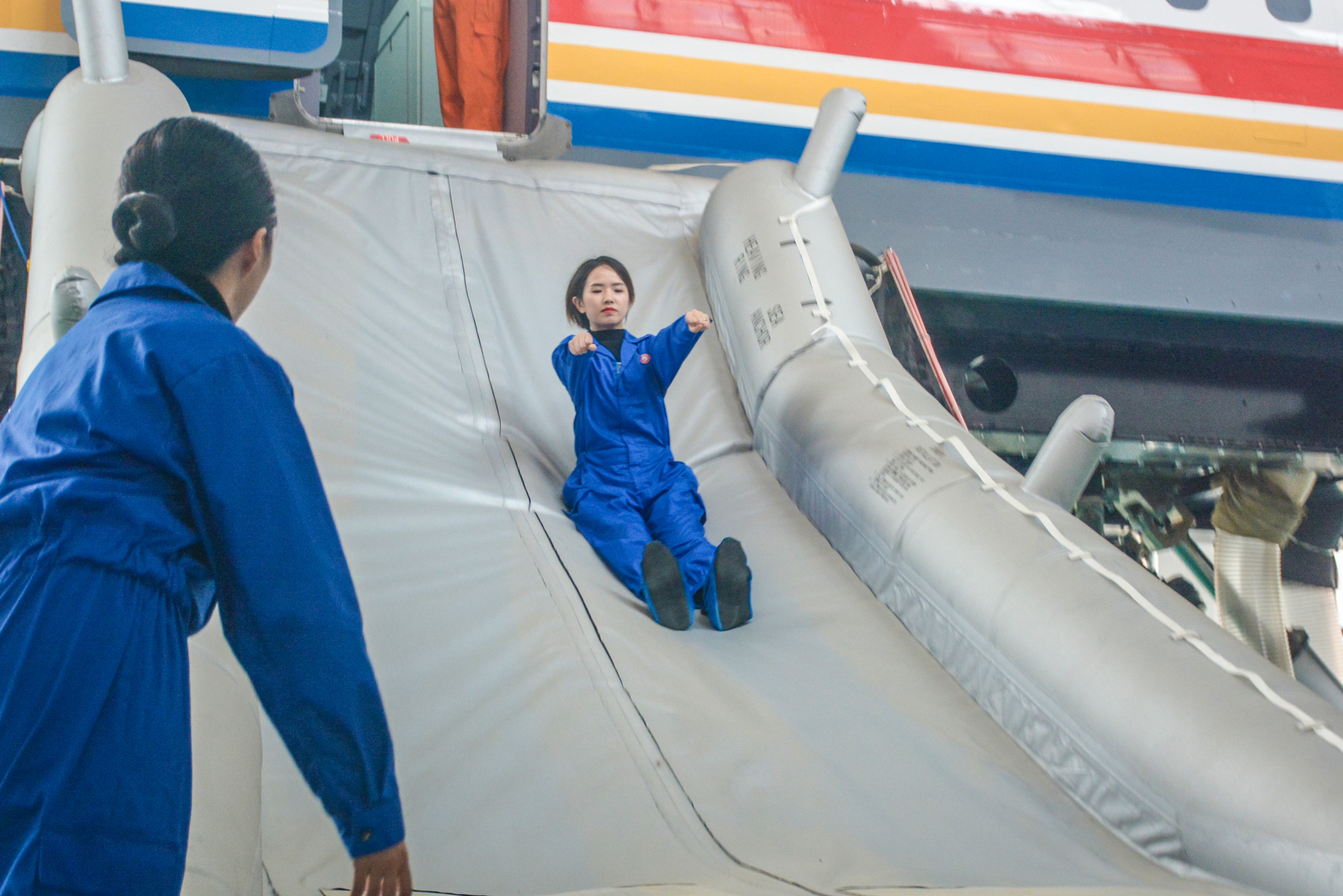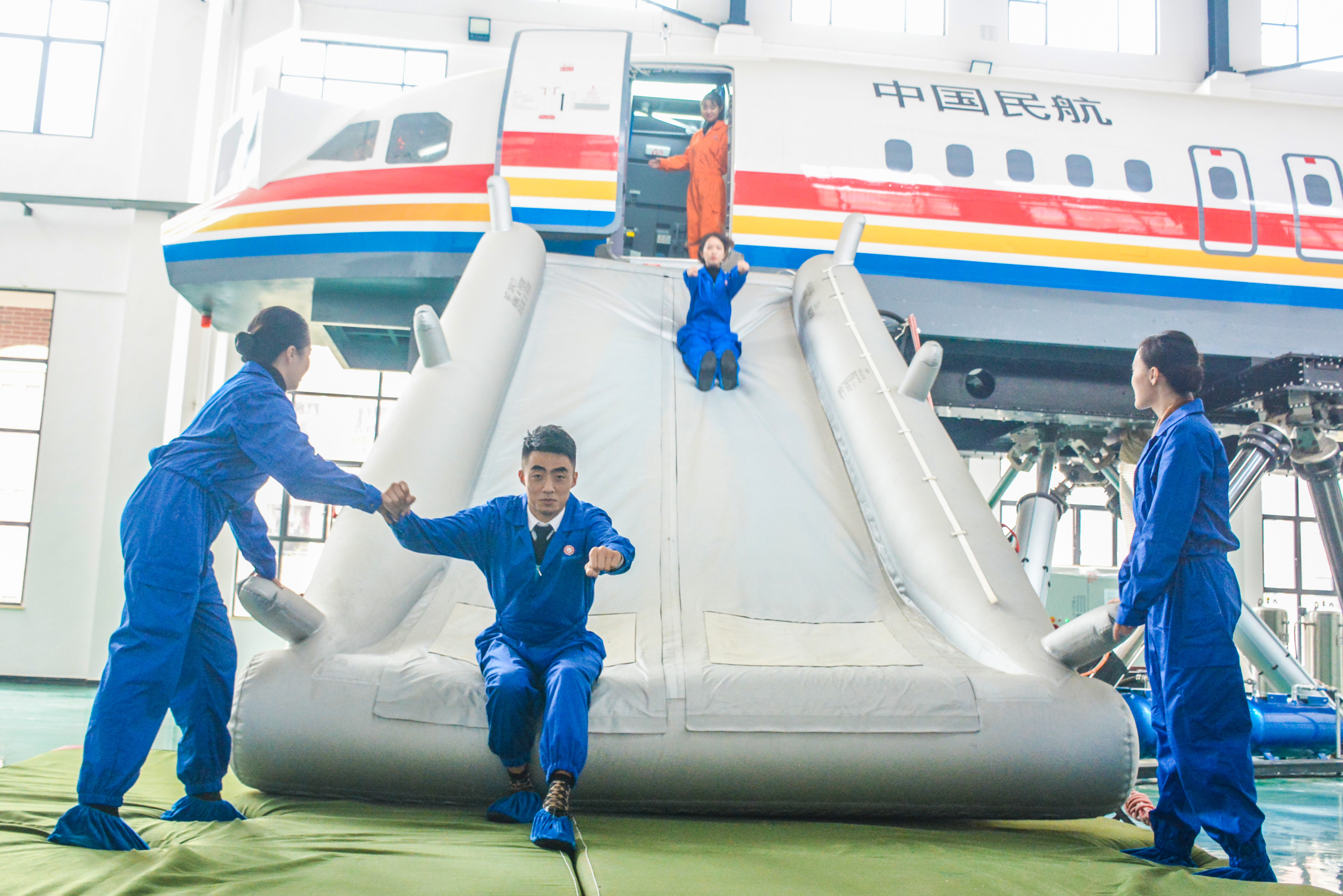 其次,还有应急撤离的实训。比如在紧急情况下正确开启或关闭飞机舱门的操作技能,它主要包括测试、安全和应急撤离等功能。由于我院实训舱舱门是由实体机型搬运组装而成,所以同学们能够体验到真实飞机机应舱门的多种功能与外观感受,包括滑梯充气模拟系统、登机门故障模拟系统和门外视景模拟系统等。