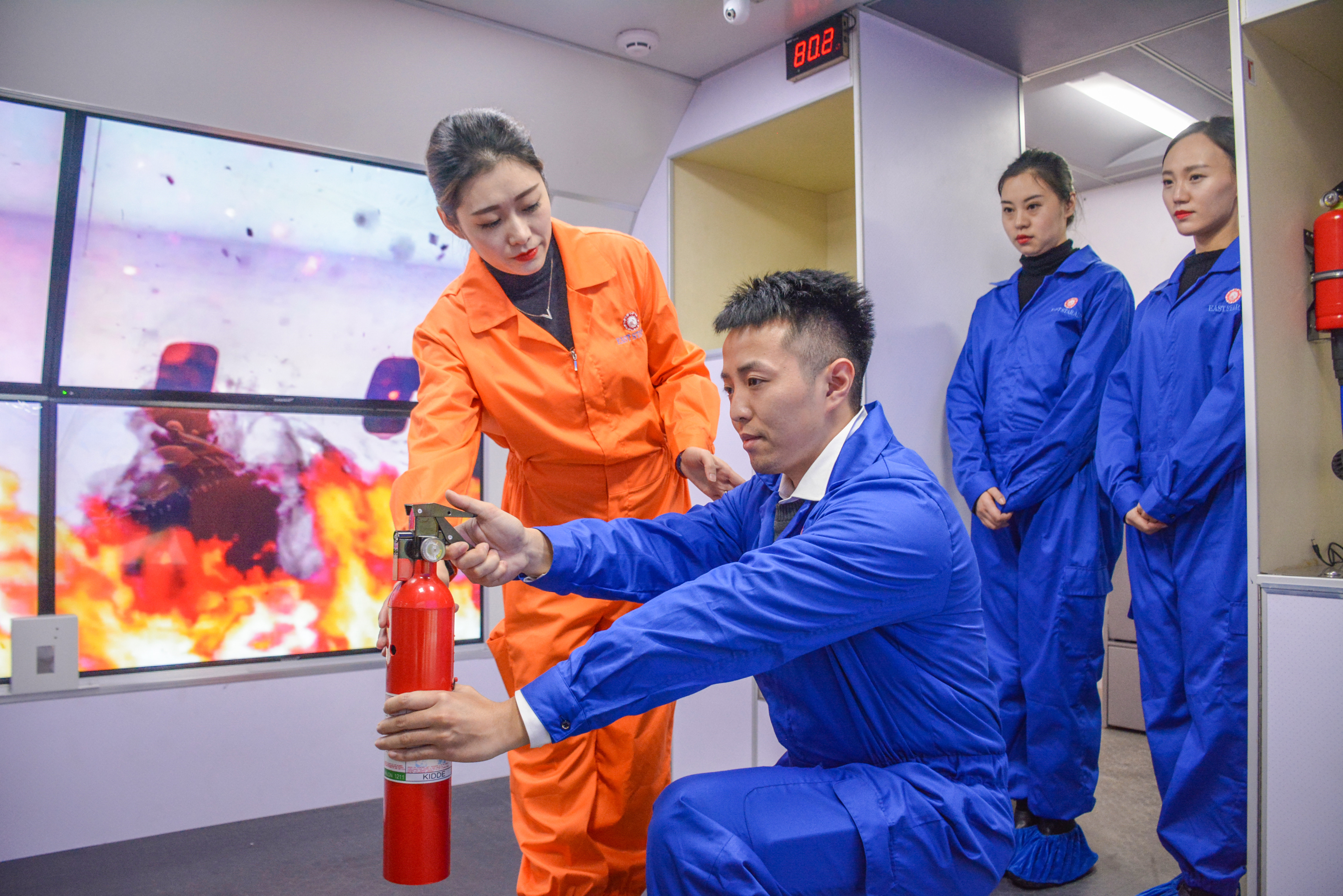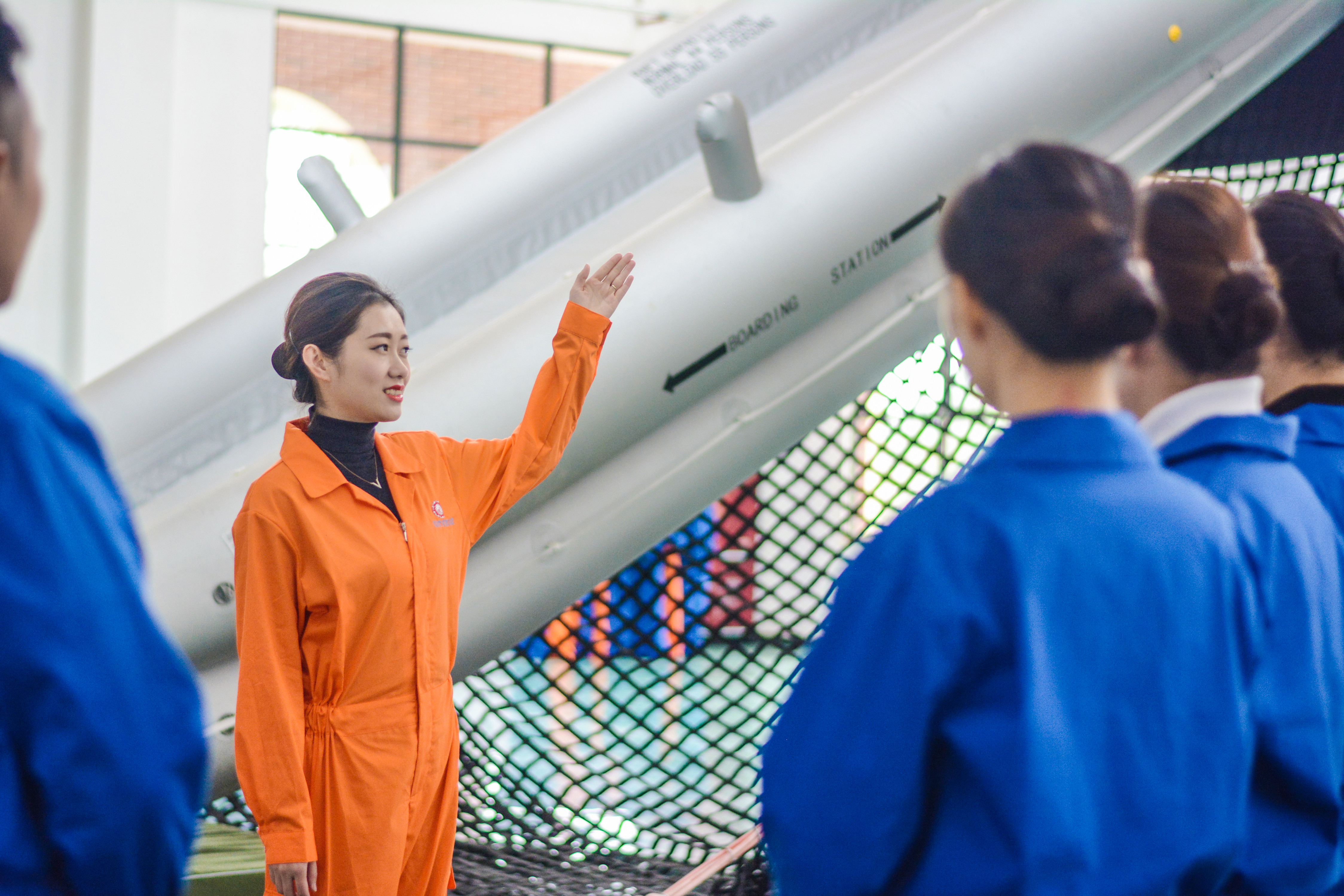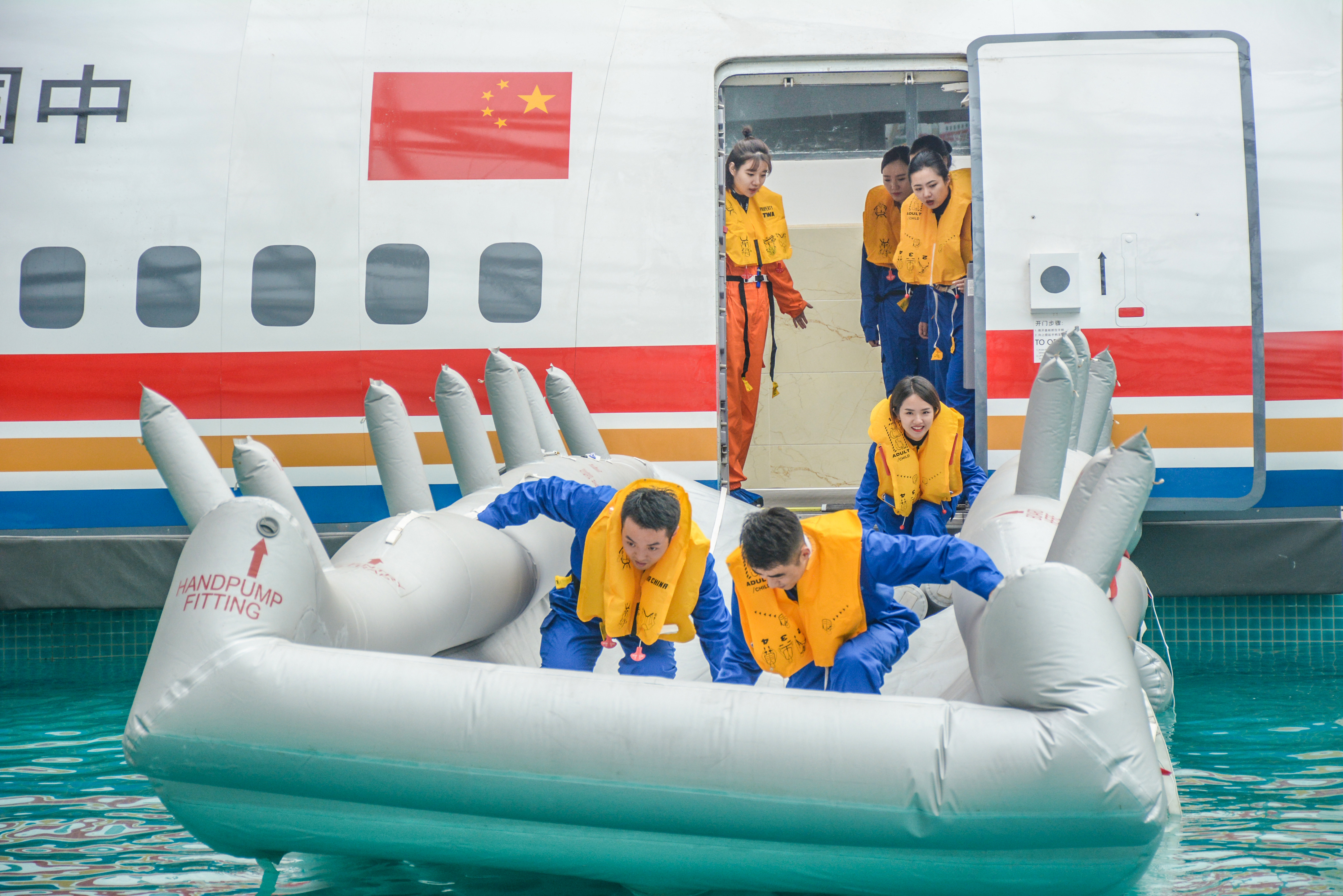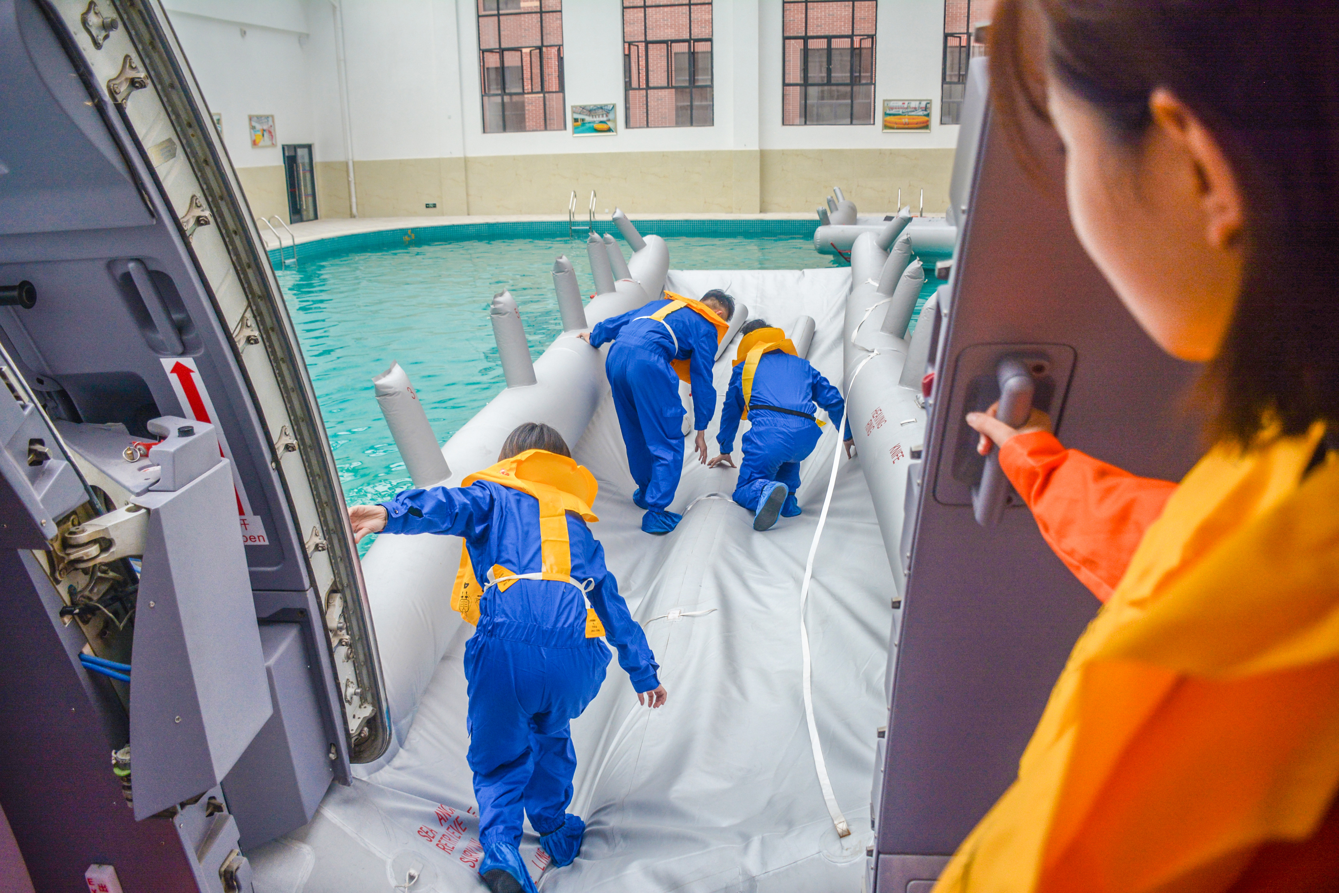其次,还有应急撤离的实训。比如在紧急情况下正确开启或关闭飞机舱门的操作技能,它主要包括测试、安全和应急撤离等功能。由于我院实训舱舱门是由实体机型搬运组装而成,所以同学们能够体验到真实飞机机应舱门的多种功能与外观感受,包括滑梯充气模拟系统、登机门故障模拟系统和门外视景模拟系统等。