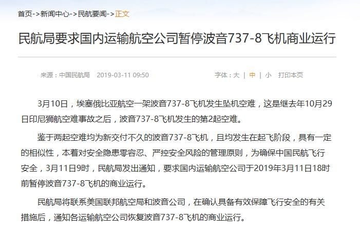 3月11日上午9时,中国民航局在全球率先发布“停飞令”:鉴于两起空难均为新交付不久的波音737-8飞机,且均发生在起飞阶段,具有一定的相似性,本着对安全隐患零容忍、严控安全风险的管理原则,为确保中国民航飞行安全,要求国内运输航空公司于2019年3月11日18时前暂停波音737-8飞机的商业运行。