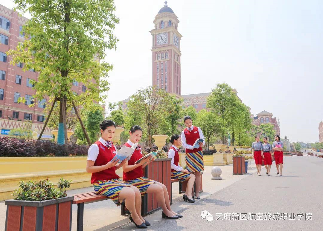4月23日上午,天府新区航空旅游职业学院书声琅琅,树荫下、亭台前、钟楼旁、实训飞机下,空姐空少们手捧着书本,徜徉在宁静的校园。