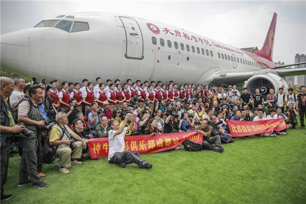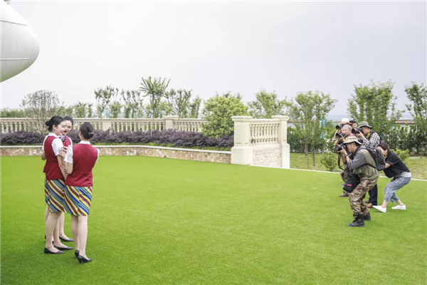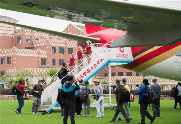 “哒哒哒……”快门声此起彼伏,在实训飞机前,无人机在上方盘旋,100多名摄影师将镜头对准飞机前的空姐们一阵猛拍,场面蔚为壮观。校园里,空姐空少成为摄影师们追逐的目标。校园欧式建筑、雕塑、钟楼、实训楼,模拟机舱、VIP贵宾候机厅等也成为摄影人一探究竟的好去处。