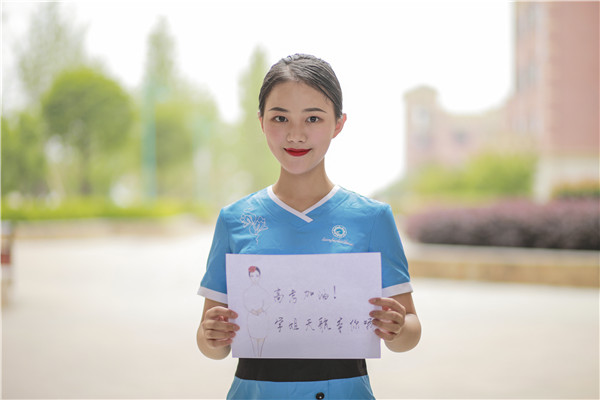 上午时分,天府新区航空旅游职业学院的空姐空少们将书写着“高考加油”、“努力努力再努力”、“愿努力不被辜负”等字样的标牌,在学院教学飞机、模拟机舱、学院大门等地,托举“学姐在天航等你”、“期待与你的一次邂逅”等标牌,给高考学子“打鸡血”!