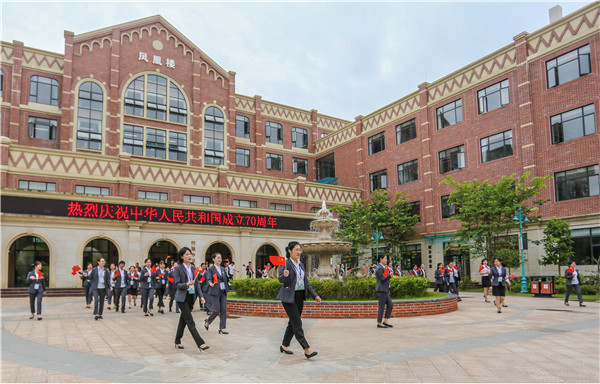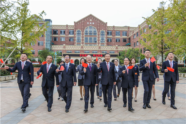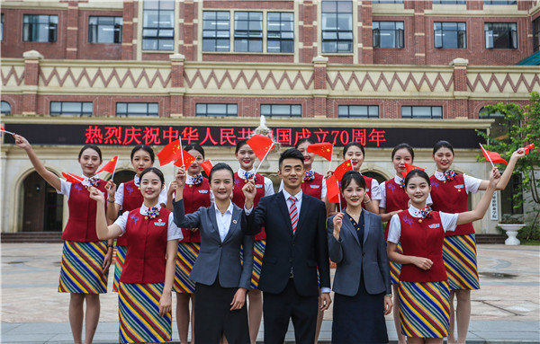 与蓝天作伴,与祖国同庆。天府新区航空旅游职业学院鲜花簇拥,歌声嘹亮,一万多名师生,挥舞着五星红旗,从四面八方聚集在体育场,为祖国母亲的生日而祝福,为航空报国的蓝天梦而歌唱。