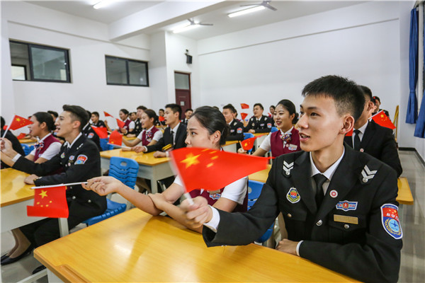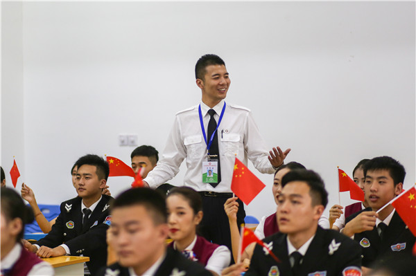体育场上,身着节日盛装的天航师生汇聚成一片红色的海洋,全院师生合唱《我爱祖国的蓝天》唱响中国梦,唱出了天航师生的心声,唱出了电影《中国机长》一一川航英雄机组中,东星航空教育集团培养出的优秀空中乘务员周彦雯学姐的动人故事。