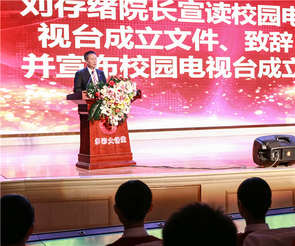 在热烈的掌声中,学院院长刘存绪教授健步上台,宣读了校园电视台成立文件,发表了热情洋溢的致辞,同时宣布:天府新区航空旅游职业学院校园电视台成立!