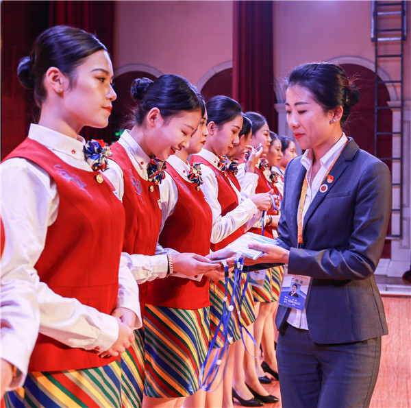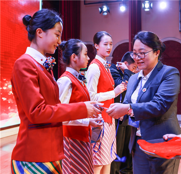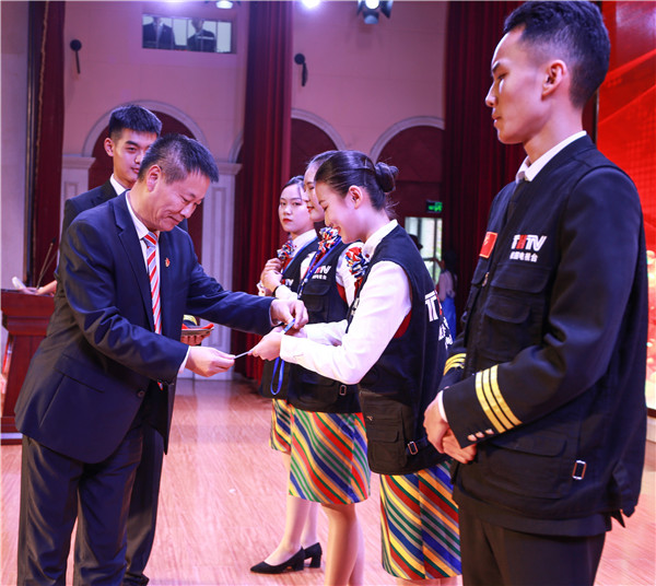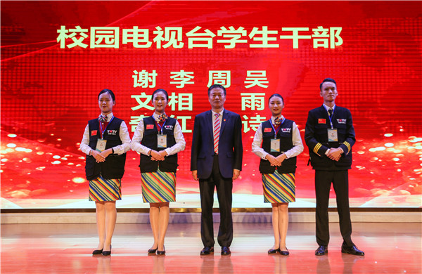 紧接着,学院院长刘存绪教授、学院宣传部部长陈勇,学院董事长助理刘盛晖,学院党政办主任冷静,高职学院院长王志鸿,中职学校负责人魏曦,高职部教务处副处长陈刚,中职学校党支部负责人陈亮,学院团委负责人王宝鹏,学院新闻办科长石慧等领导分别上台为校园电视台100多名同学授发工作牌。