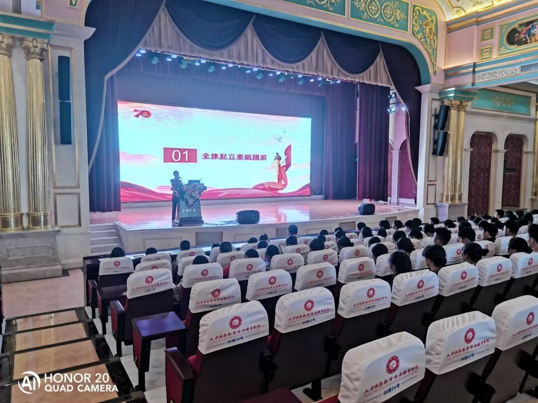 全体起立奏唱团歌“光荣啊中国共青团”。嘹亮的歌声回荡在大讲堂,让每位同学深刻意识到自己是共青团员的重要性。