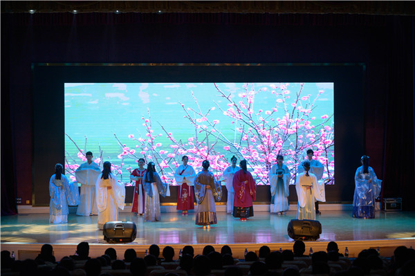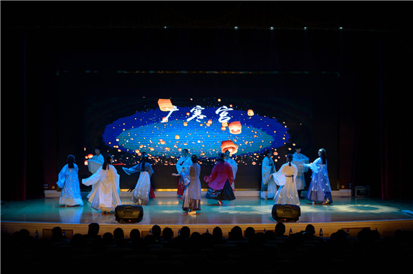 随后汉服社带来的服装秀《广寒宫》,轻盈的步伐、迷人的微笑,华丽的服饰展示了光芒璀璨的中华传统文化。